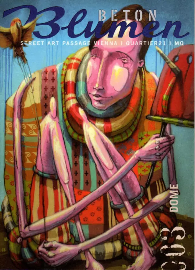 Christian Krämer (*1975, Karlsruhe) alias DOME wirft in seiner Malerei einen Blick hinter die Fassaden aus Kleidung, Statutssymbolen und Masken, welche sich die Menschen aus Selbstschutz, Eitelkeit oder Anpassung erschaffen. Unter fröhlich anmutenden, mit bunten Mustern bedeckten Gewandbergen, die jedoch gleichzeitig überwältigend und erdrückend wirken, zeigt der Künstler zerbrechliche, fleischliche Wesen, die vom Leben gezeichnet und erschöpft wirken. Die feingliedrigen, rosafarbenen Figuren, deren lange Gliedmaßen an zarte Insektenbeine oder an von Fäden gelenkte Marionetten erinnern, treten dabei in distanzierte Beziehungslosigkeit mit ihresgleichen, sind melancholisch nachsinnend oder auch einsam musizierend in karge Landschaften mit dürren Bäumen und einzelnen fliegenden Vögeln gesetzt.