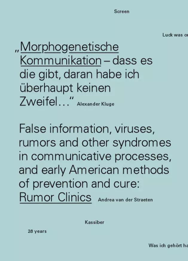 “Rumor Clinics—About misinformation, viruses, rumors and other diseases in communicative processes and about early American preventive and healing methods” is the result of her research on a seemingly bizarre political institution in the USA, whose threatening topicality seems to be taken from a science fiction fairy tale. In a long conversation with the author, director and producer Alexander Kluge, she expands on these media and narrative-critical approaches. Kluge's initial thesis is that “we need to create a narrative space in which we can repair ourselves”: “Morphogenetic communication—I have absolutely no doubt that it exists.”